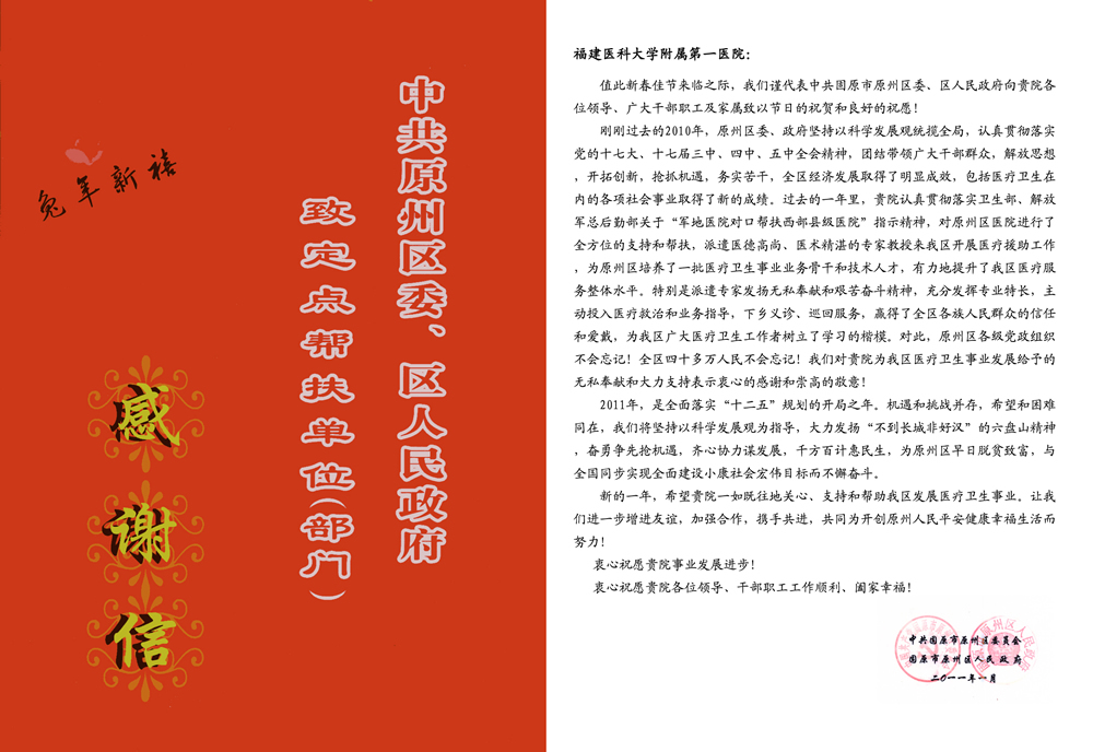 春节前夕,中共固原市原州区委、区人民政府向我院发来感谢信,对我院定点帮扶该区医疗卫生事业发展给予的无私奉献和大力支持表示衷心的感谢和崇高的敬意!